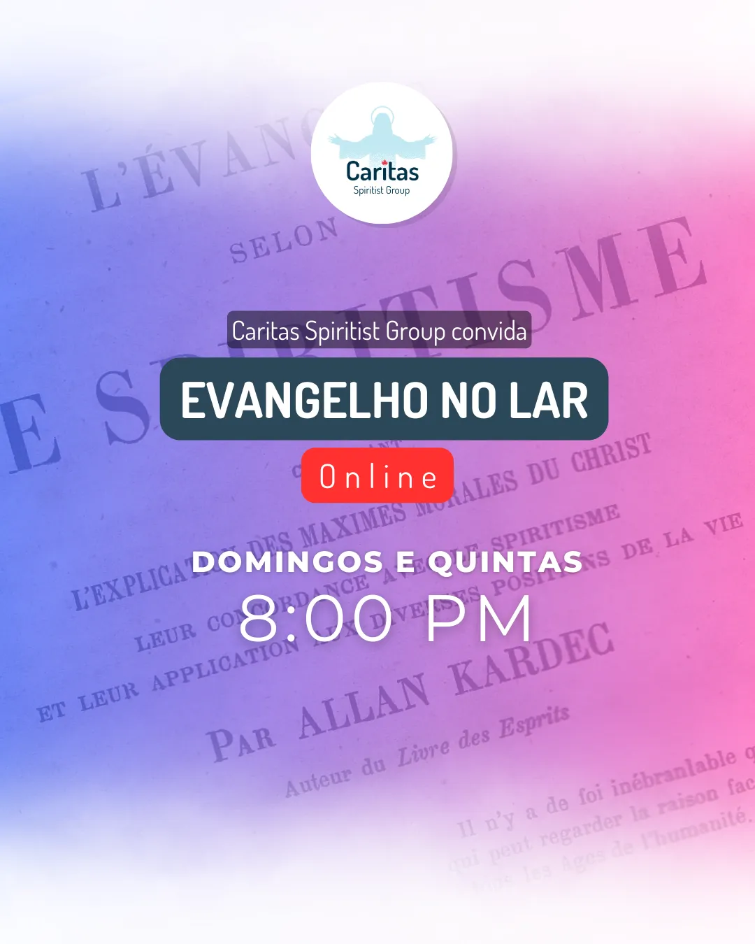 Sinta-se acolhido por essa doutrina libertadora de amor e caridade. Venha participar dos nossos encontros, com a fé alicerçada na razão. TodXs são bem-vindXs!